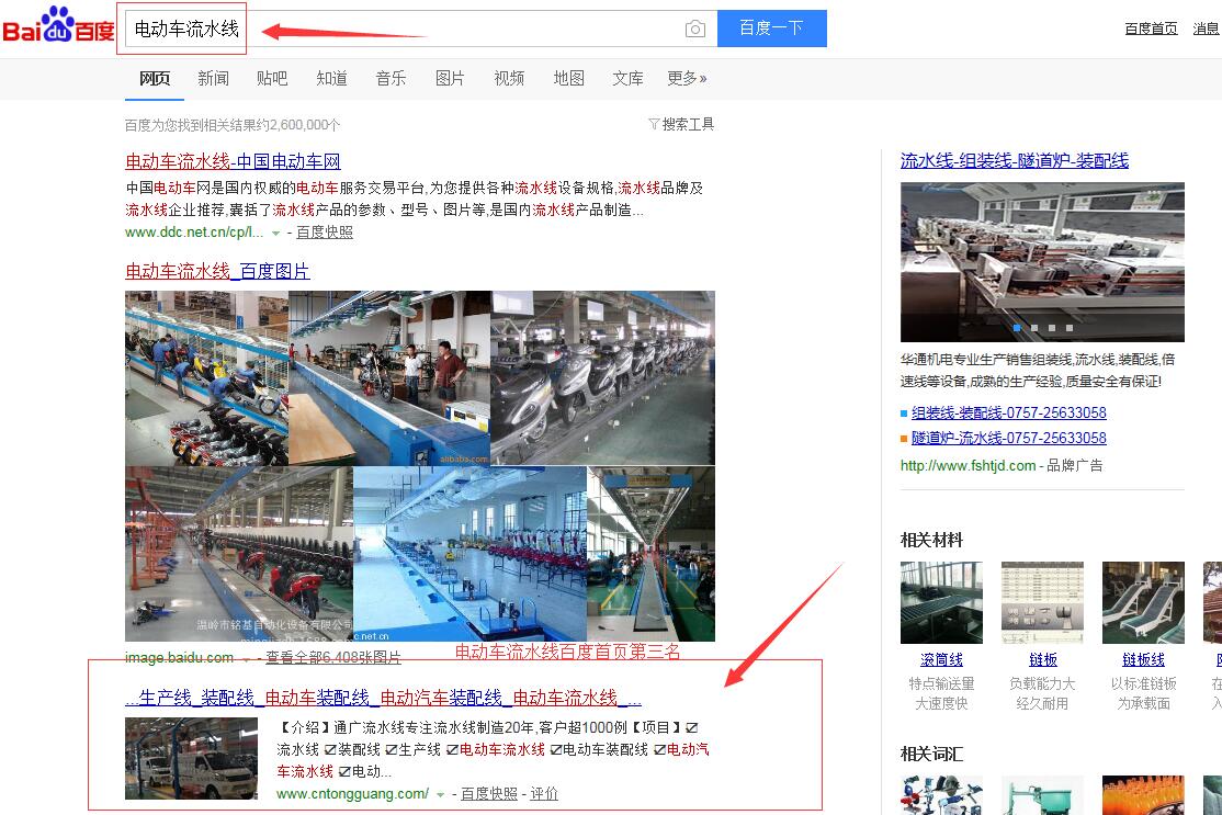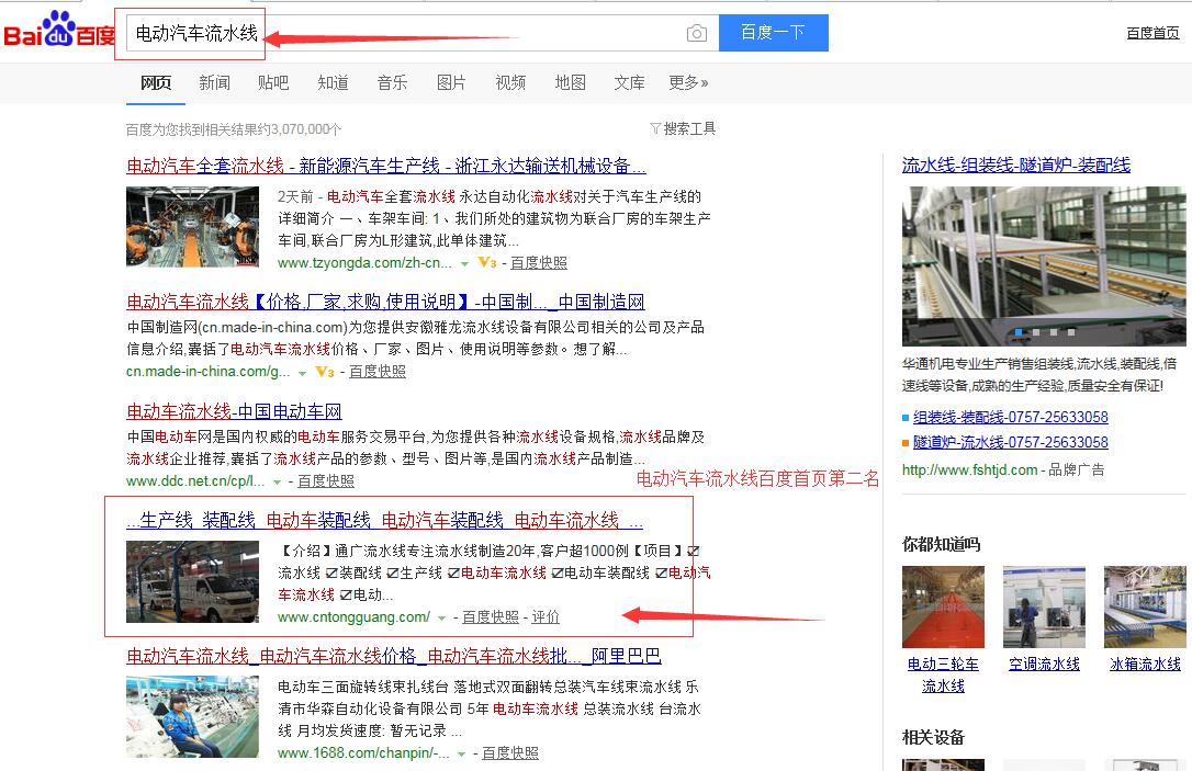 “電動(dòng)車裝配線”百度首頁(yè)第一名,請(qǐng)看下方截圖 ,“電動(dòng)車流水線”,“電動(dòng)汽車流水線”,“電動(dòng)汽車裝配線”,等等,很多關(guān)鍵詞都在百度首頁(yè),請(qǐng)看如下截圖,有圖為證。在此特意感謝臺(tái)州SEO(通盛網(wǎng)絡(luò))人員為我公司網(wǎng)站所做的付出與努力